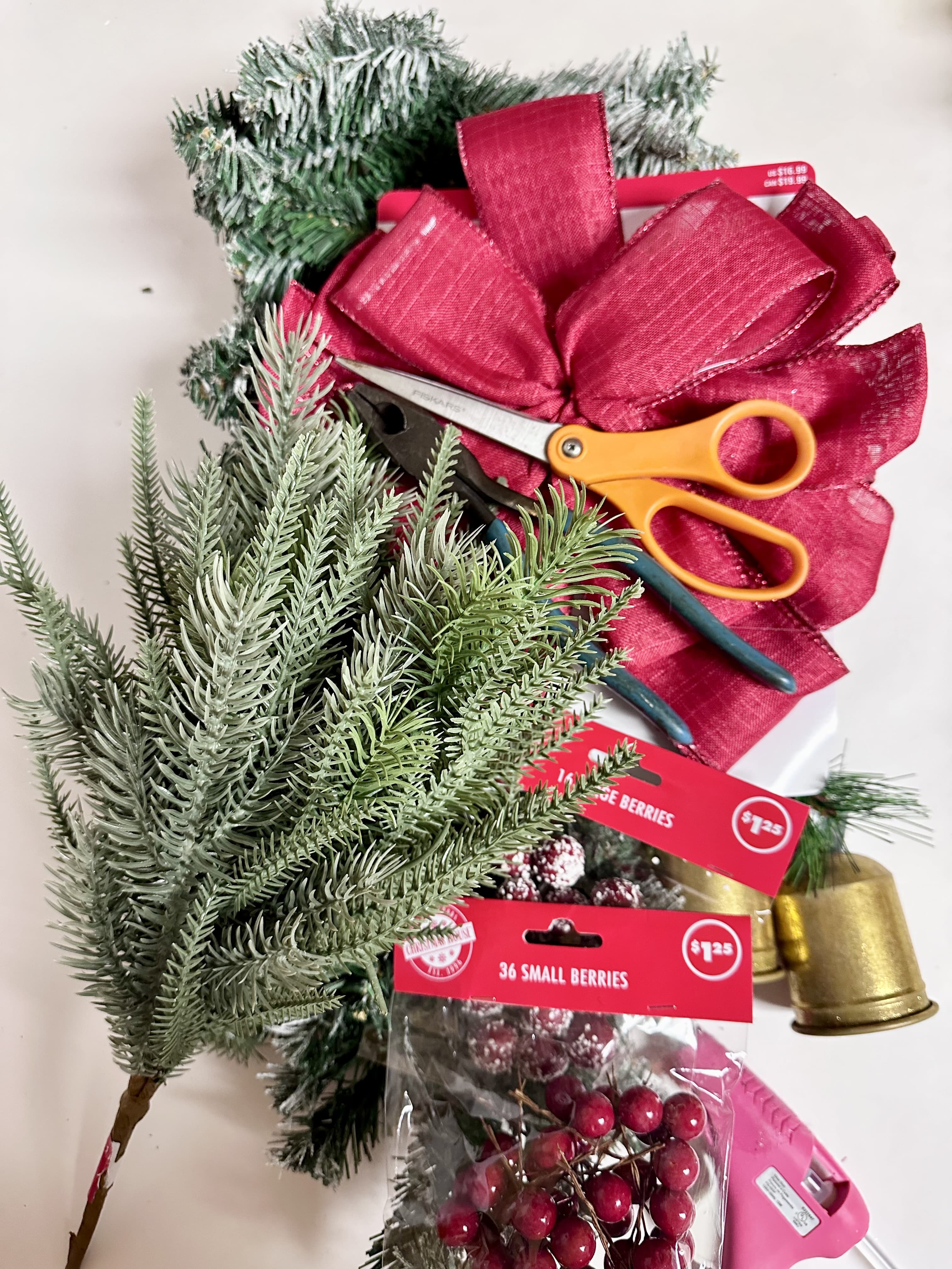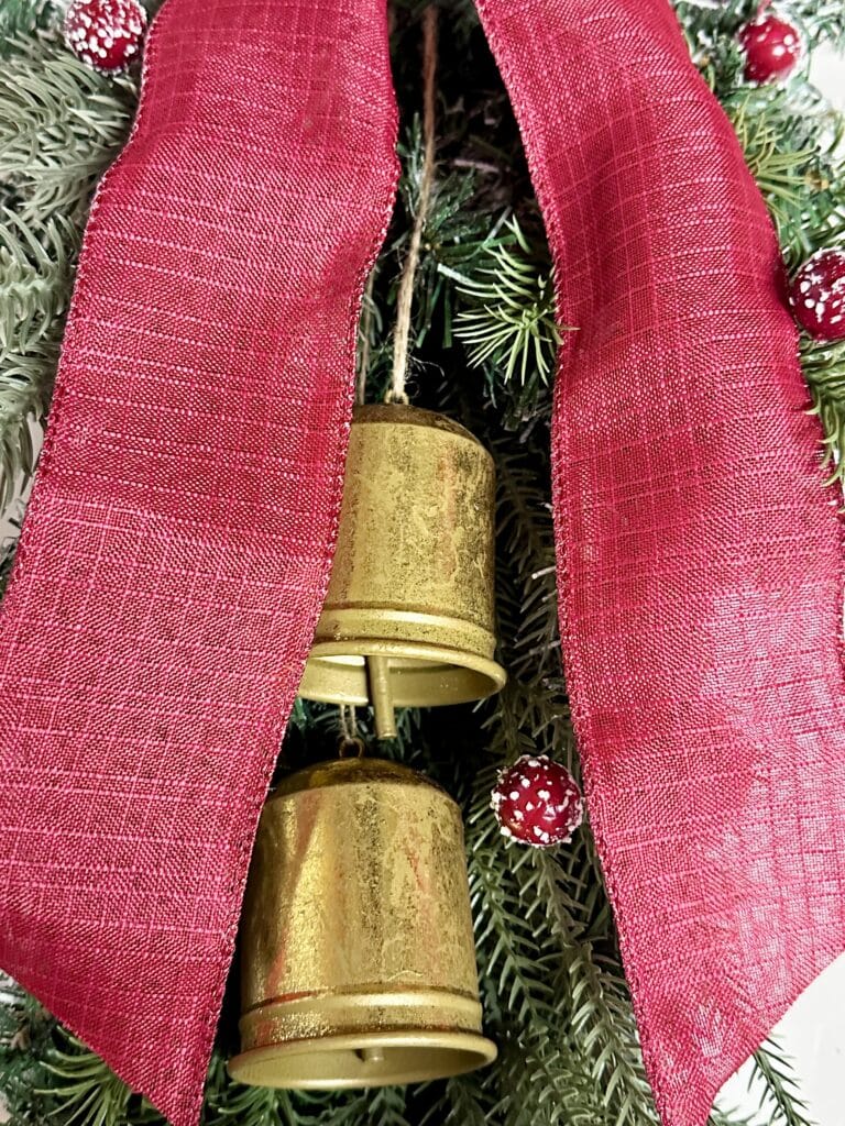The bells I used had ribbon. I instead cut off the ribbon and used twine to hang them from underneath the bow. I liked the look of the twine but you can obviously do what you prefer.
