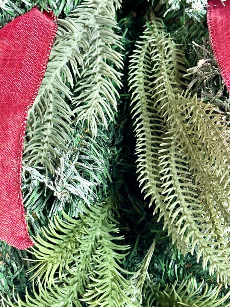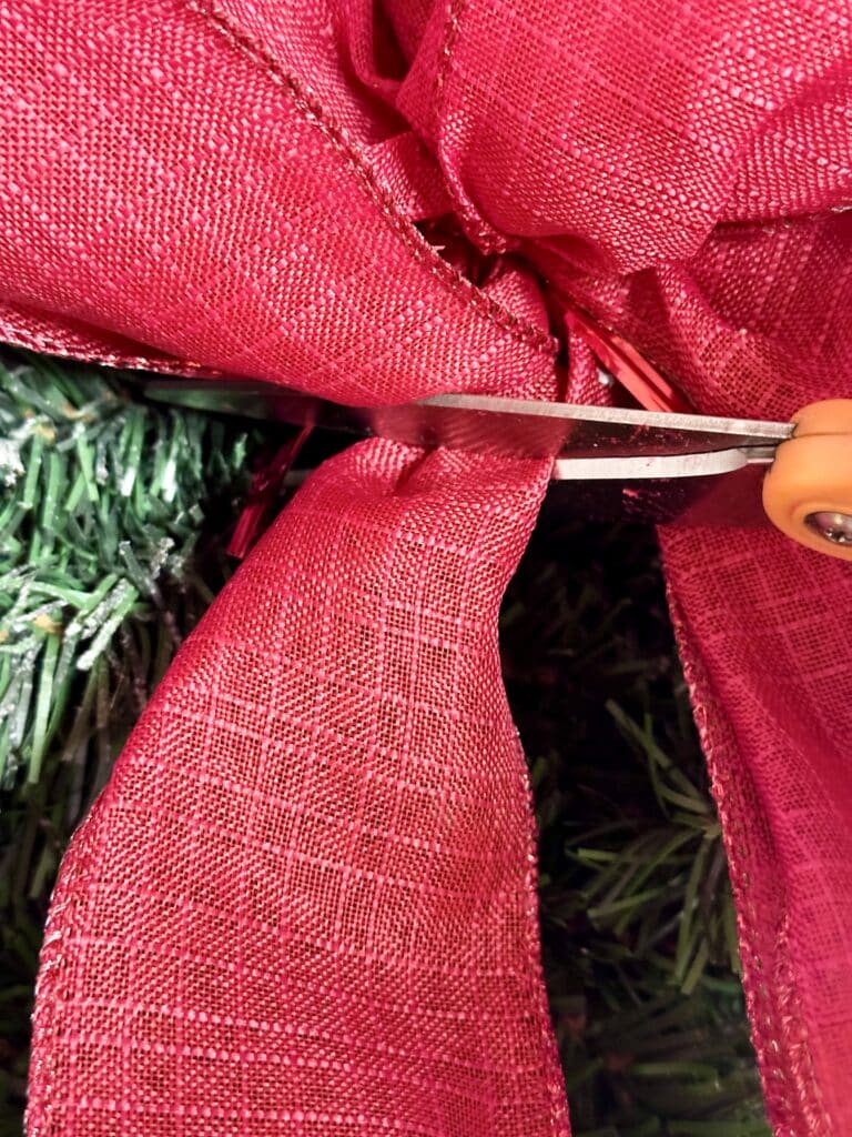 Cut the back pieces of the bow tails off. This is optional–I thought it looked better with the shorter tails. Use the twist tie to attach the bow to the top of the swag. I usually do the bows last, but this adds a focal point as you’re decorating the rest of the swag.
