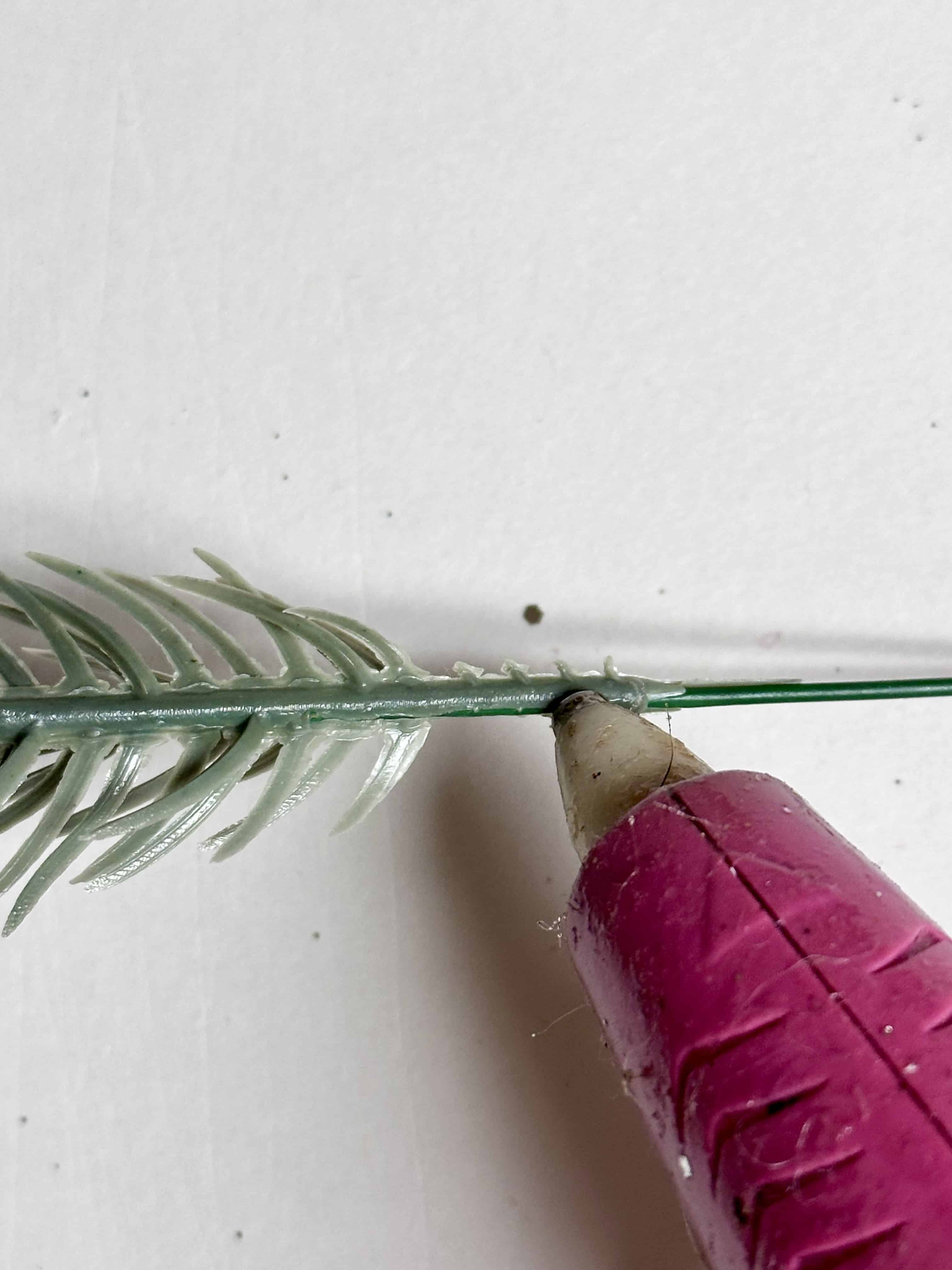 Depending on the size of your evergreen stems and how full you want them to be, you can cut them into smaller pieces with wire cutters (if needed) or leave them as is. Place the stems in the swag by adding a line of hot glue and pressing it firmly onto the swag branches.