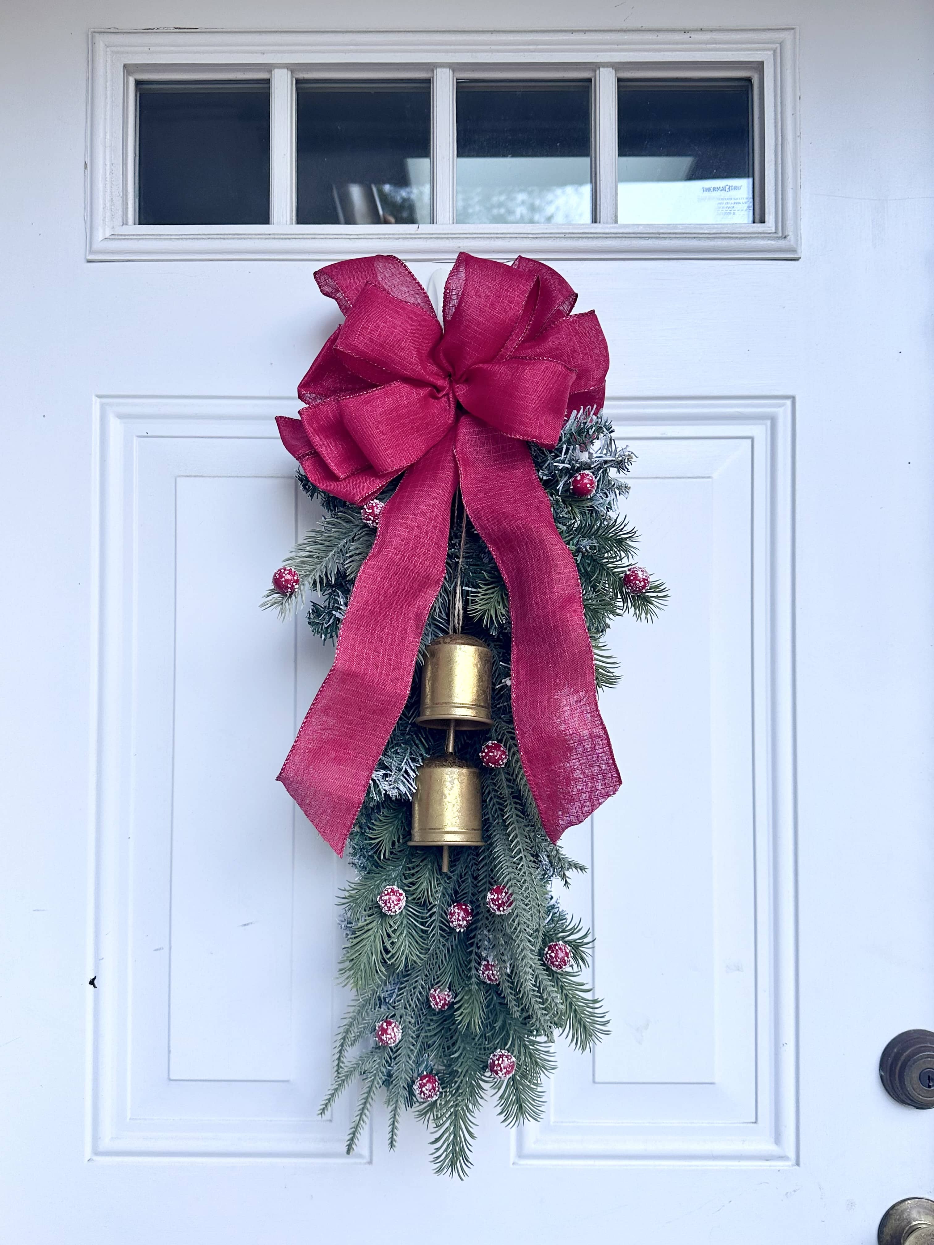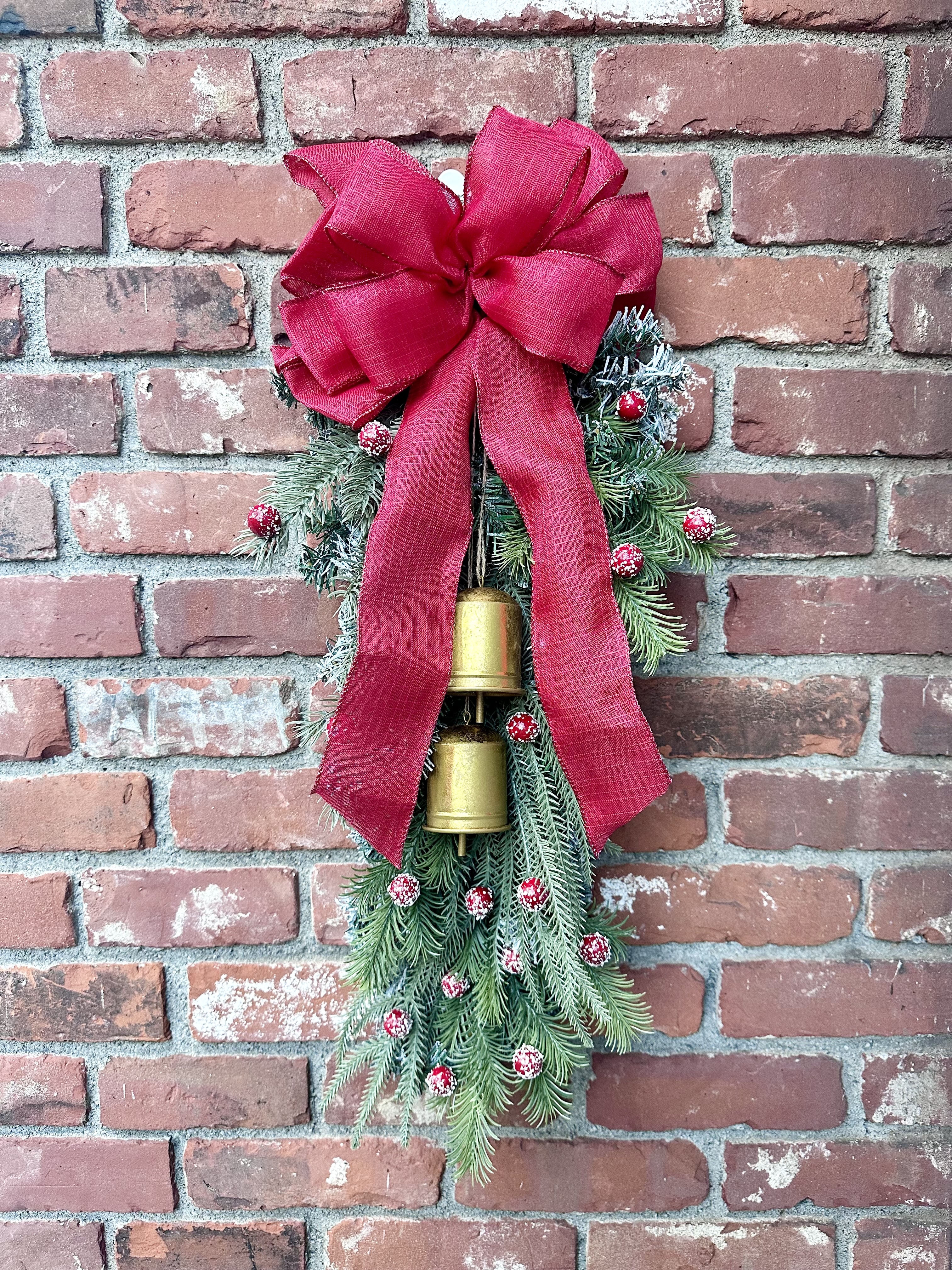 I’ve said it before, but I do love a classic red and green Christmas look. I always gravitate back to evergreen branches with red berries and a big bow. This evergreen brass bells swag is an easy variation on a classic Christmas wreath. It’s suitable for almost anywhere in the house, including a front door (as long as it’s a bit sheltered!).